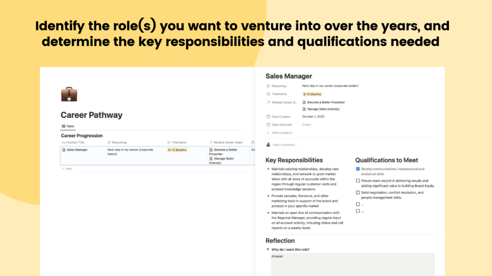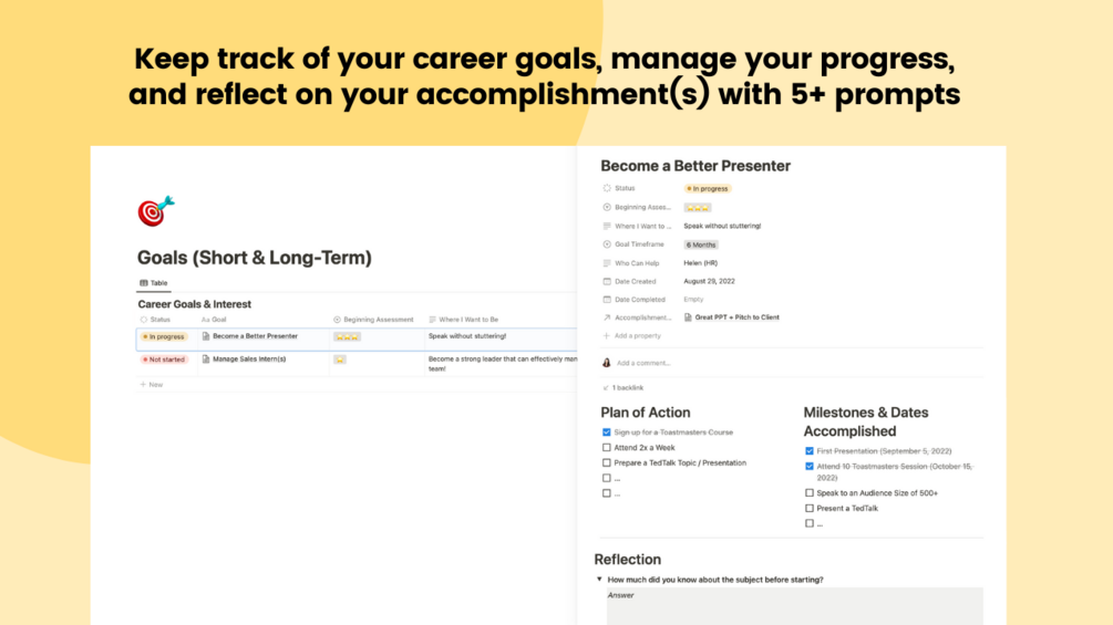 🎯 Goals (Short & Long-Term) with built-in databases for you to track your career goals, manage your progress, and 5+ prompts to encourage reflection on your accomplishment(s).