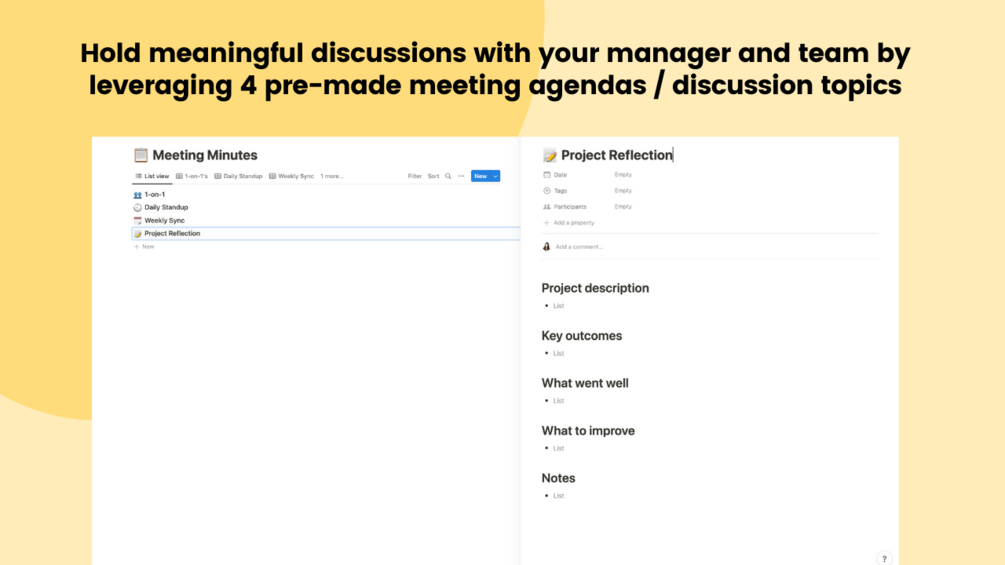 📋 Meeting Minutes with 4 pre-made meeting templates for you to leverage to facilitate meaningful discussions (1-on-1, Daily Standup, Weekly Sync, Project Reflection).