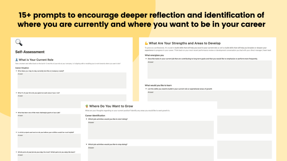 🔍 Self-Assessment with 15+ prompts to encourage deeper reflection and identification of where you are and where you want to be in your career.